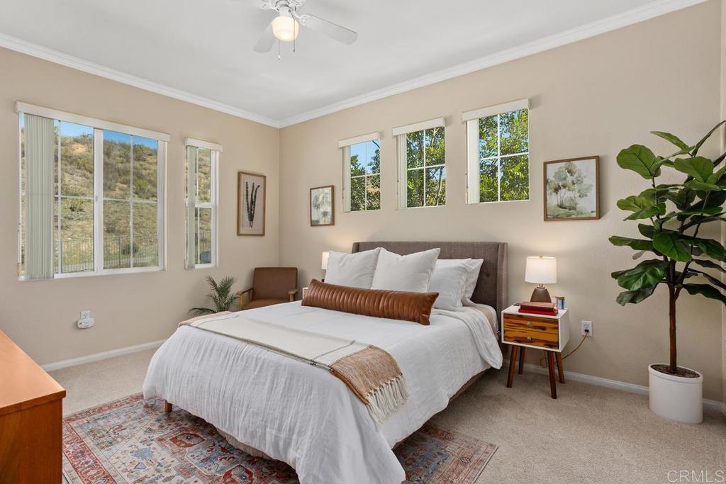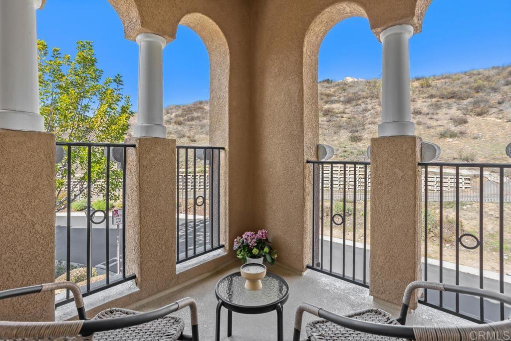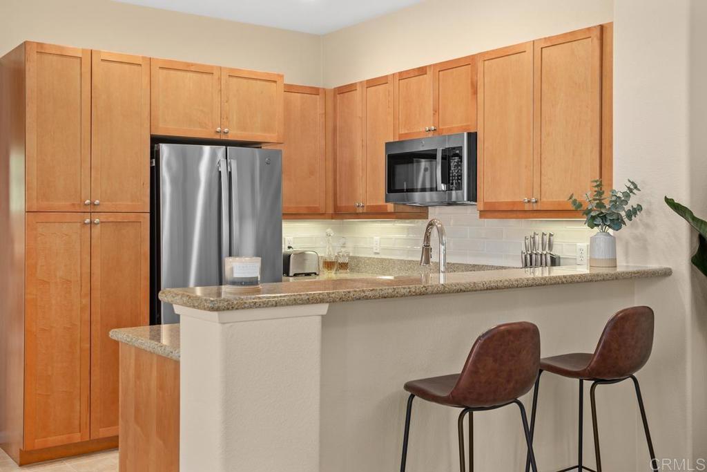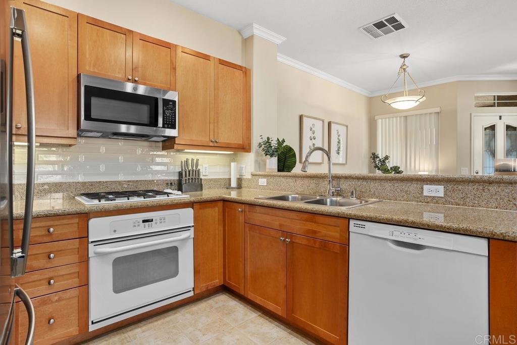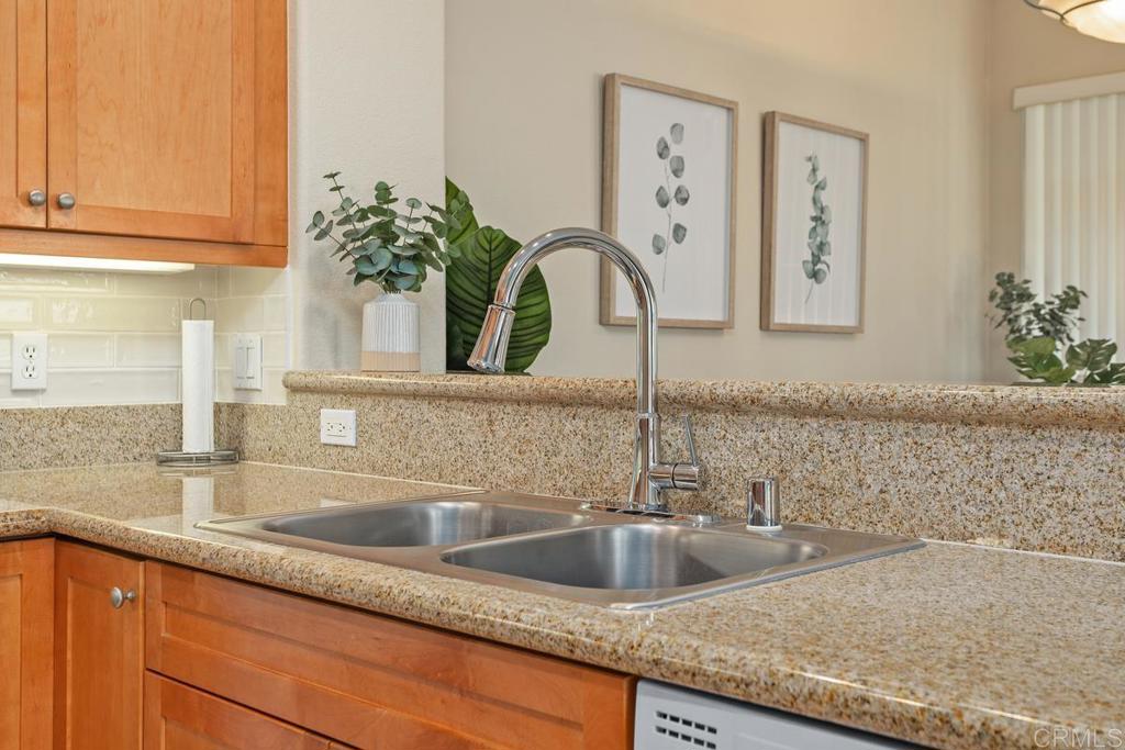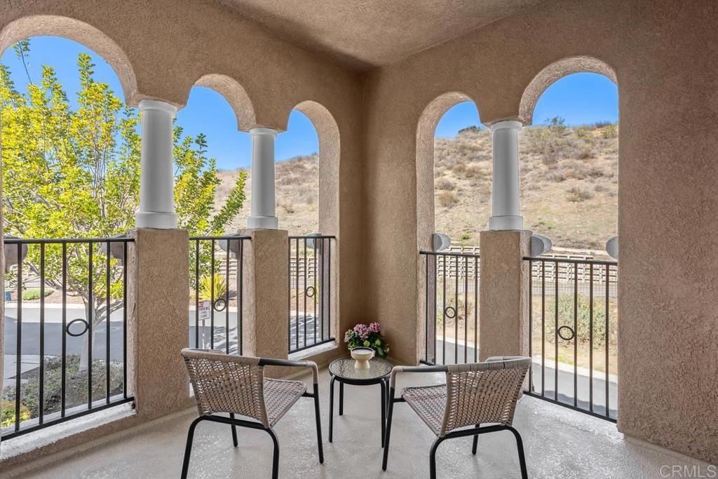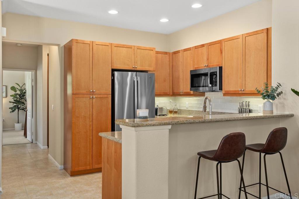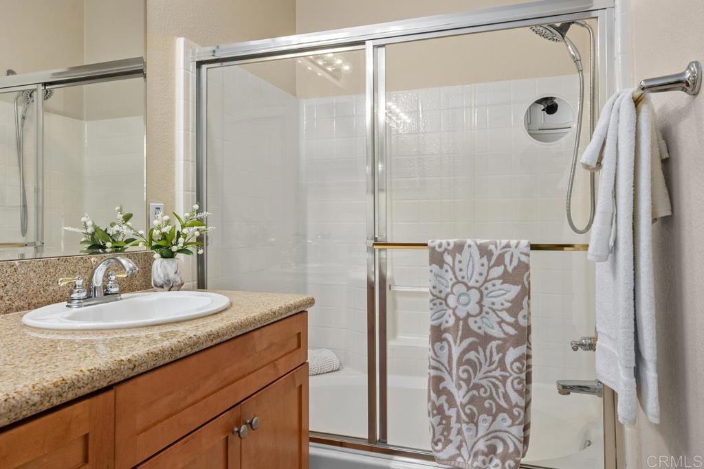 Meticulously maintained by the original owners and used as a secondary residence, this quiet and bright home in one of the best locations in the complex offers extra windows in the primary bedroom thanks to premium building placement. Features include newer GE appliances (counter depth refrigerator, microwave, cooktop, dishwasher), new carpet in living areas, updated steel plumbing lines, newer water heater, new toilet in bath two, Ring video doorbell and new front door hardware. Also, a spacious one car garage with hanging storage. Enjoy resort-style amenities: pool, spa, fitness center, clubhouse, tennis and indoor sports courts, playground and BBQ area. Walk to Sabre Springs Market Place, parks and trails. Located in the top rated Poway School District.