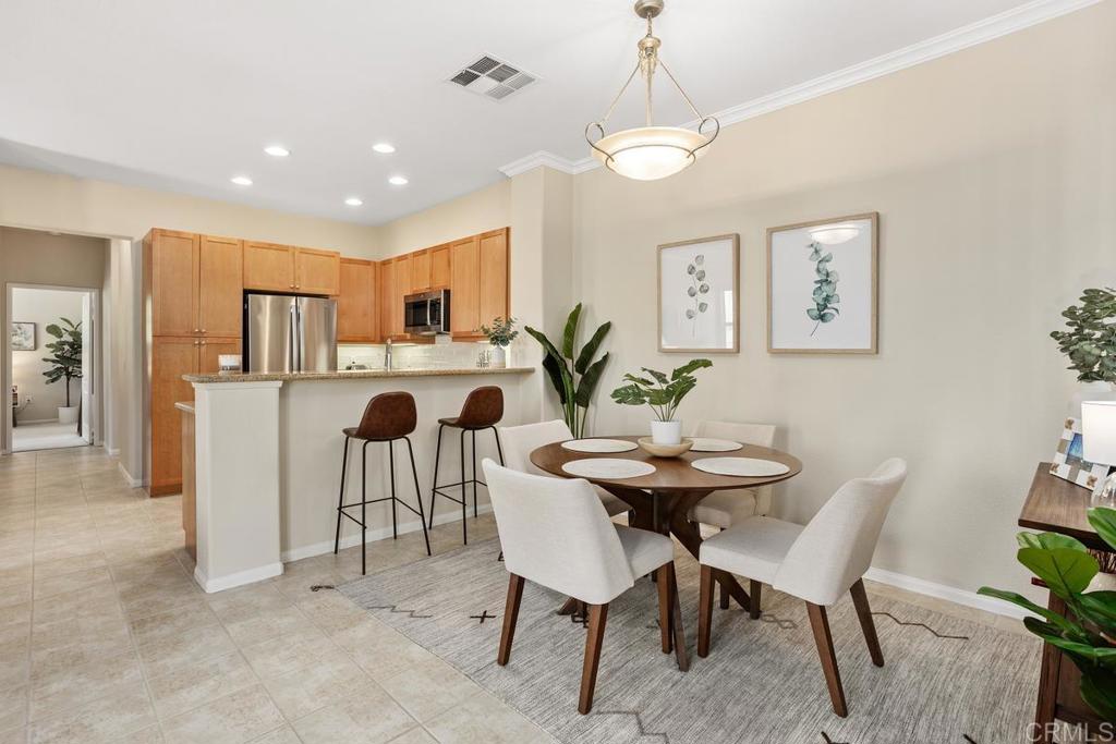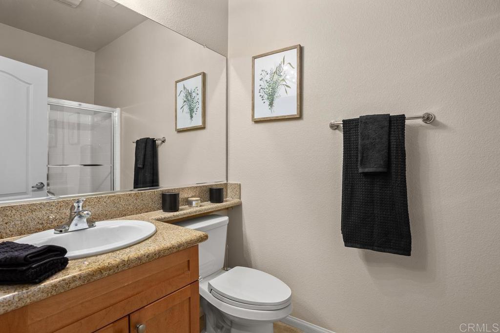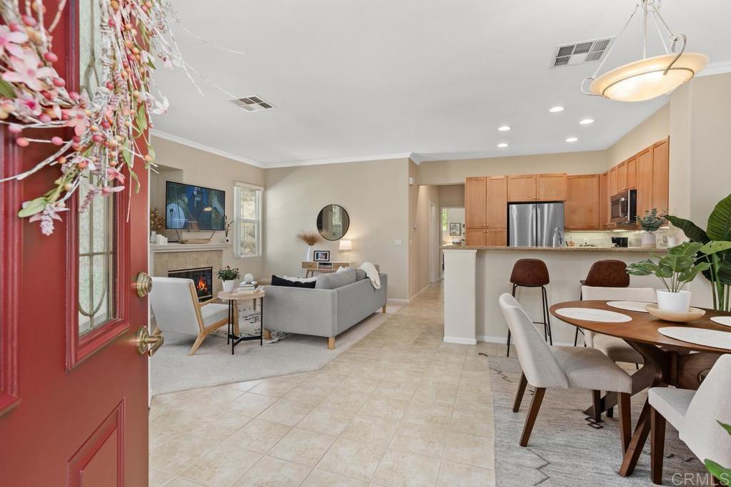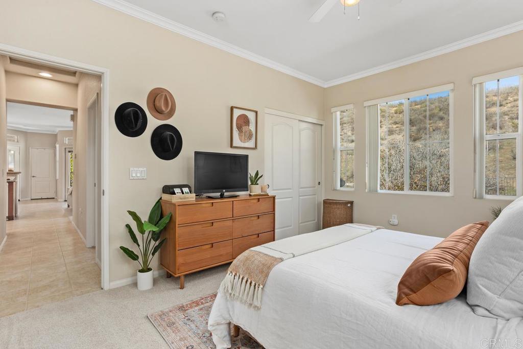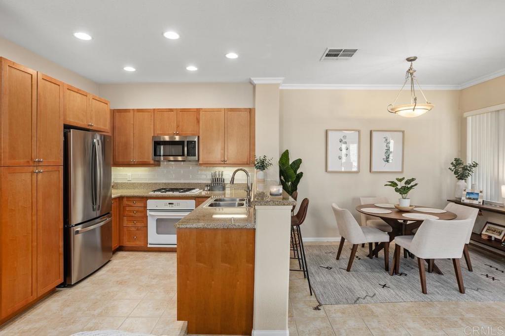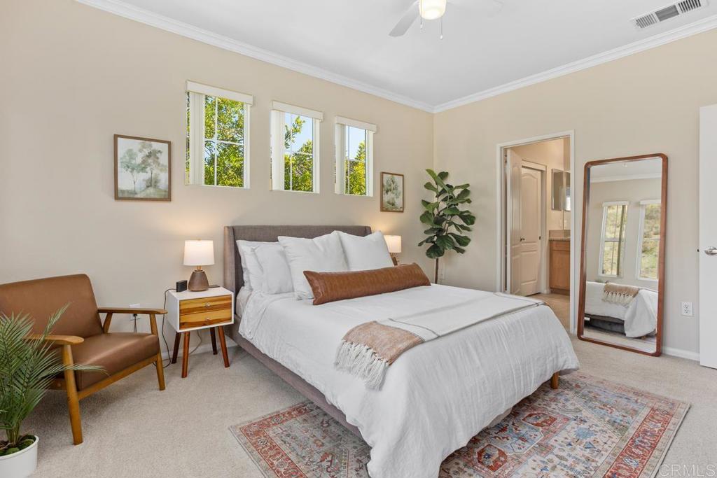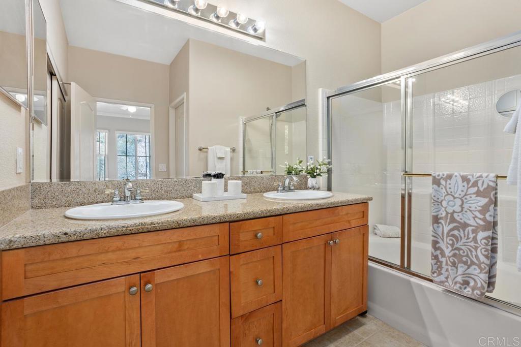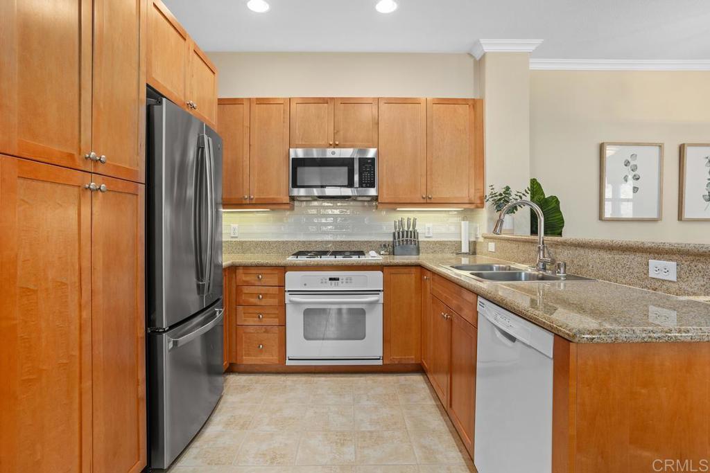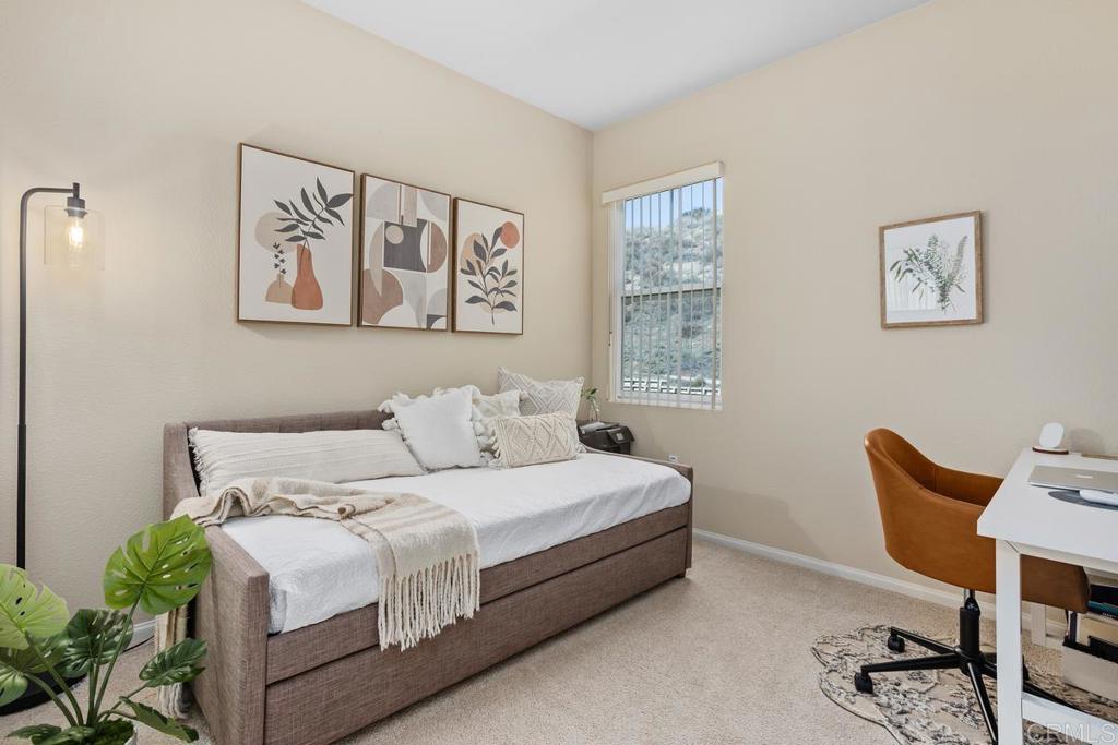 Meticulously maintained by the original owners and used as a secondary residence, this quiet and bright home in one of the best locations in the complex offers extra windows in the primary bedroom thanks to premium building placement. Features include newer GE appliances (counter depth refrigerator, microwave, cooktop, dishwasher), new carpet in living areas, updated steel plumbing lines, newer water heater, new toilet in bath two, Ring video doorbell and new front door hardware. Also, a spacious one car garage with hanging storage. Enjoy resort-style amenities: pool, spa, fitness center, clubhouse, tennis and indoor sports courts, playground and BBQ area. Walk to Sabre Springs Market Place, parks and trails. Located in the top rated Poway School District.